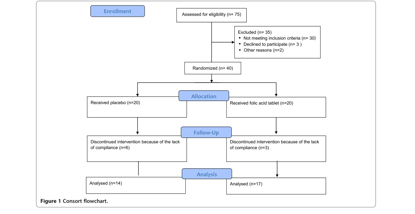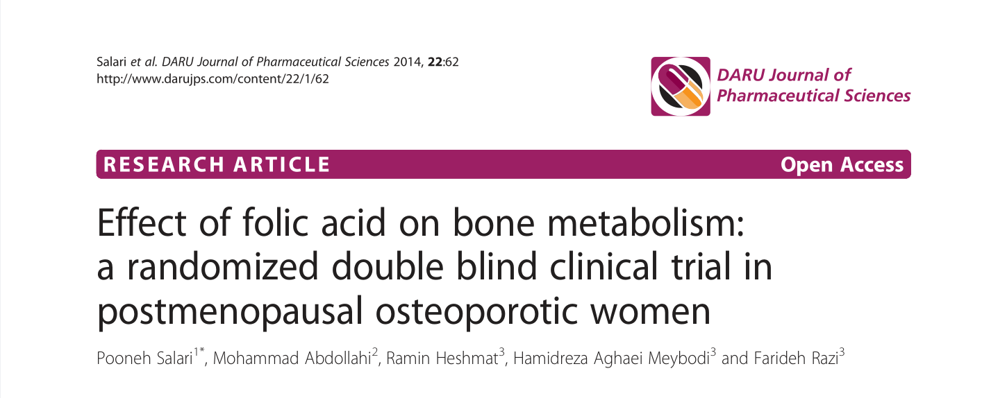 2014-ben egy iráni kutatócsoport egy randomizált, kettős vak vizsgálatot tett közzé a *DARU Journal of Pharmaceutical Sciences* folyóiratban (IF 4,088 akkoriban), amely a folsav hatását vizsgálta a posztmenopauzában lévő csontritkulásban szenvedő nőkre. Negyven résztvevőt vettek fel: 17-en a folsav-csoportban és 14-en a placebo-csoportban (néhányan kiestek). 6 hónapig követték őket.