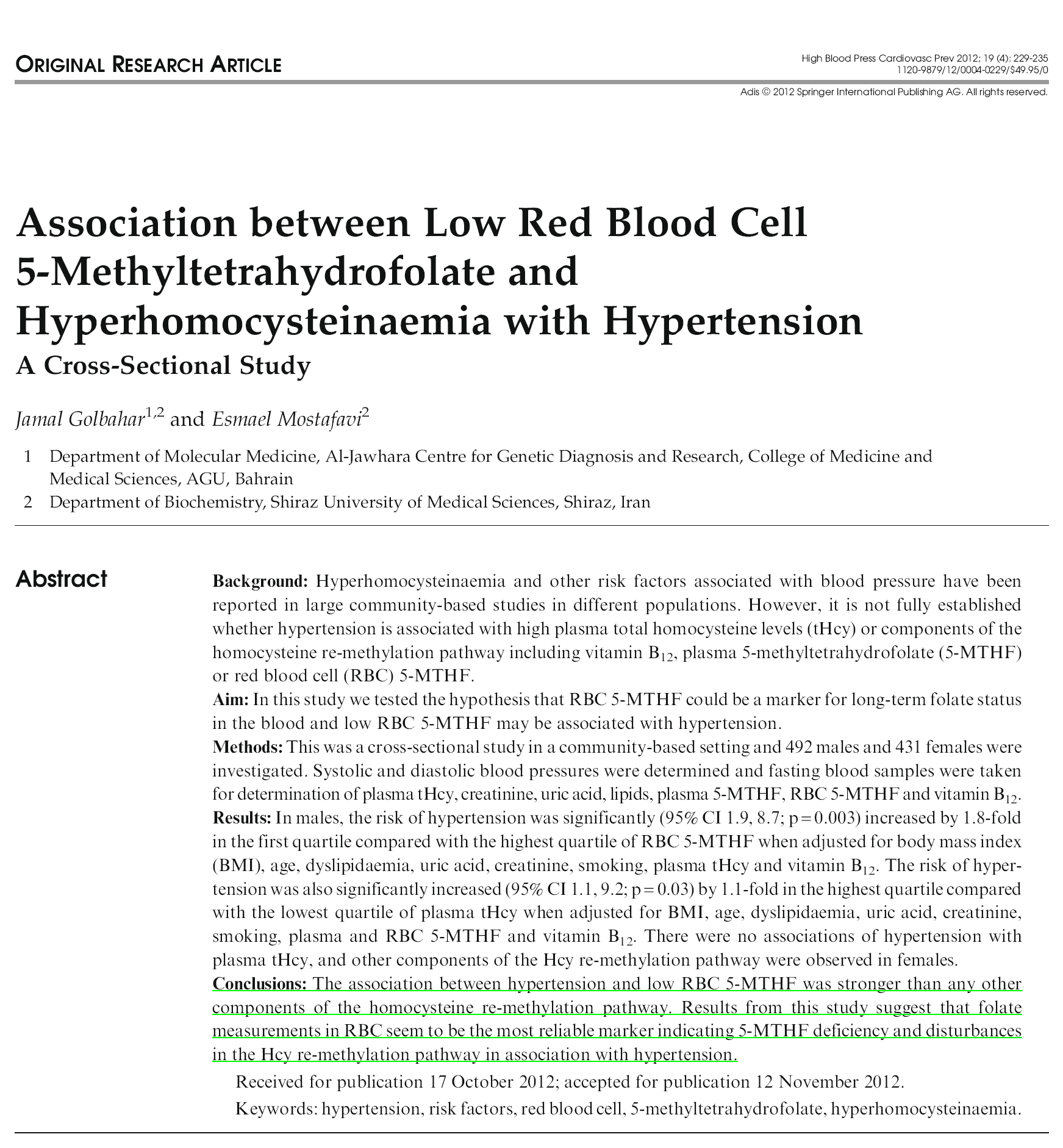 [1] Az alacsony vörösvérsejtszámú 5-metil-tetrahidrofolát és a hyperhomocysteinaemia és a hipertónia közötti összefüggés. *Magas vérnyomás és szív- és érrendszeri megelőzés*, 2012.